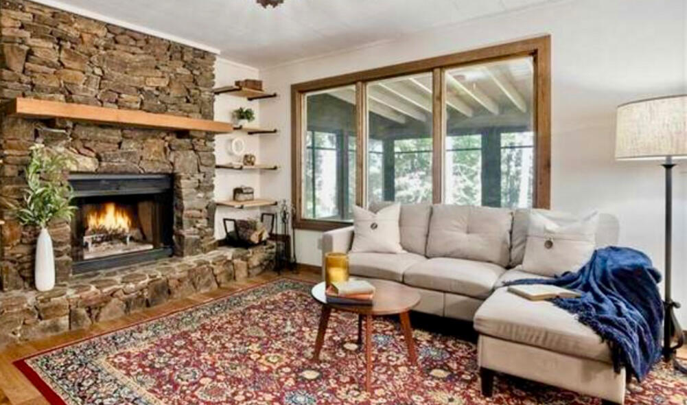 115 Big Canoe Staging Project Agent: Margot Weatherford EXP Realty. My inspiration was the stunning view, stone fireplace and exposed beams.